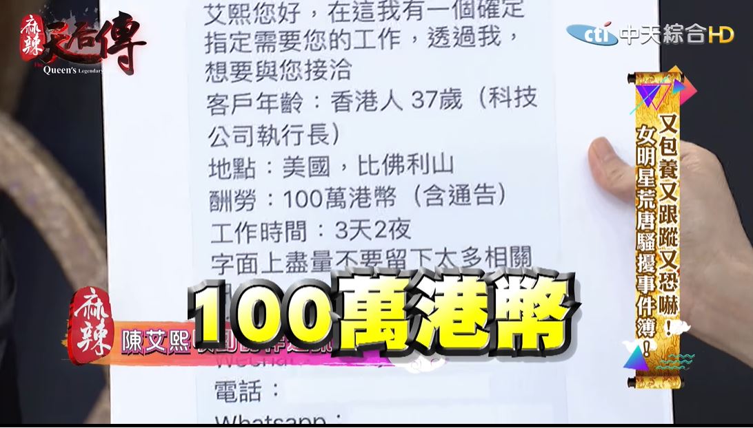陳艾希公開自己收到的伴遊訊息,上面就寫著「艾熙您好,在這我有一個確定指定需要您的工作,透過我,想要與您接洽」。對方是一名37歲的香港人,也是科技公司的執行長,伴遊的地點在美國比佛利山,3天兩夜的時間酬勞是100萬港幣,相當於400萬台幣左右,且上頭註明「含通告」,也就是包含「性交易」的意思,甚至強調出發前可以先付訂金。