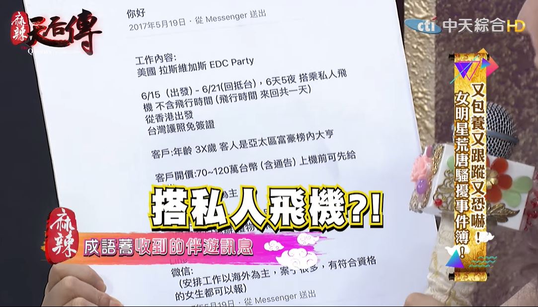 成語蕎也收過類似的訊息,美國拉斯維加斯6天5夜,開價70~120萬台幣(含通告),且強調上飛機前可先給一半。不少女星都收過類似的訊息,甚至還有人收過男粉絲的全裸自拍,讓她們相當困擾,且刪除封鎖都沒有用,瘋狂的粉絲還會再開別的帳戶繼續騷擾。