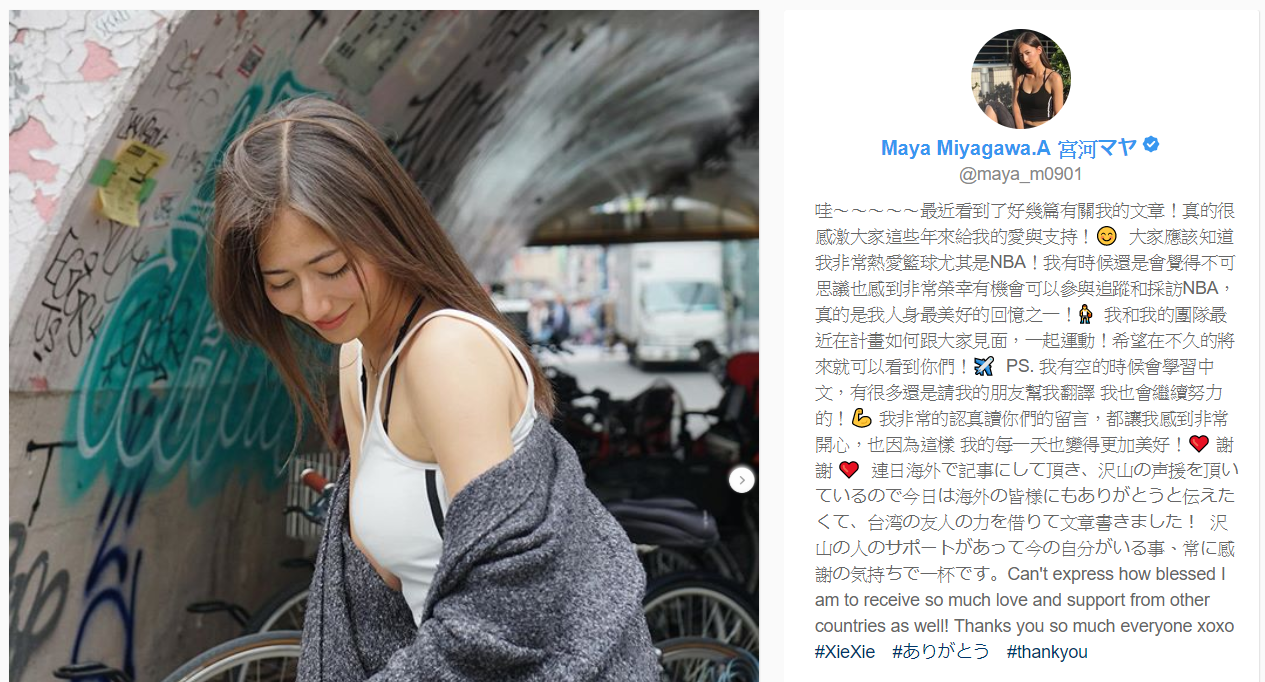 如今宮河麻耶也常常更新個人IG,向粉絲們分享她的日常生活,除了向大家介紹鍛鍊身體曲線以及訓練美臀的方式,也有自己到各地參與賽事及採訪的生活照,而每張照片少不了的就是她的完美身材,她的蜜桃美臀加上長腿更是擄獲許多粉絲的心,更特別的是宮河麻耶先前也透過台灣的友人,在IG用中文發文感謝台灣粉絲的支持,可說是人美心也美的代表。