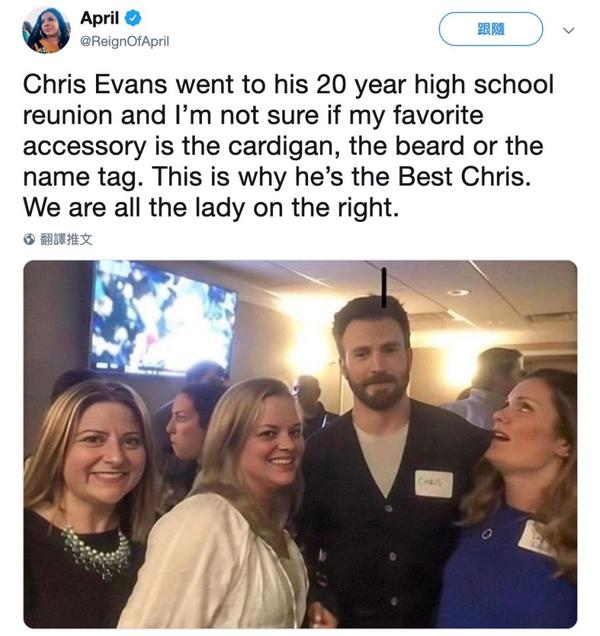 克里斯伊凡(Chris Evans)胸前還別著「Chris」的字樣超親民,這些照片也透過當事人的推特放送,變成各大媒體報導的焦點,《復仇者聯盟 4 : 終局之戰》(Avengers 4:Endgame)後克里斯伊凡(Chris Evans)新聞還是不斷,依舊是大家心目中的「美國隊長」。