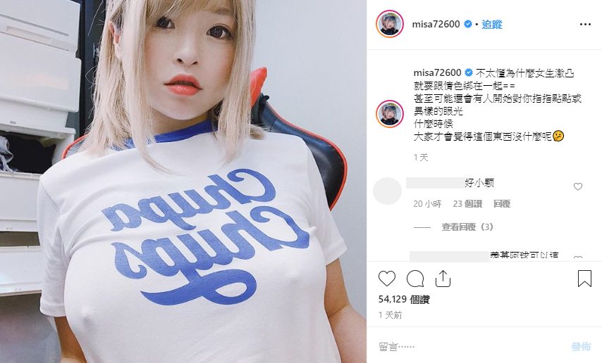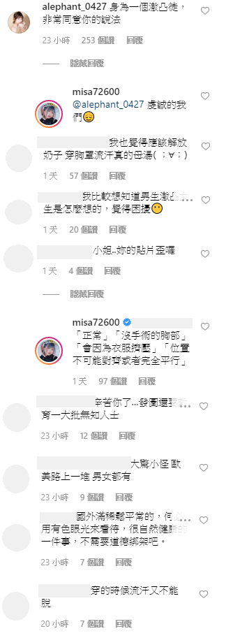 照片上傳之後,實況主阿樂便打上:「身為一個激凸徒,非常同意你的說法」,米砂也搞笑回應:「虔誠的我們」,還有其他網友留言:「我也覺得應該解放X子 穿胸罩流汗真的母湯」、「我也在想為什麼男生可以激凸。女生激凸就在哪邊五四三的⋯阿⋯不都是人」、「可能是台灣人的觀念比較保守吧 所以才會往那方面想」、「佩服misa敢說出那些大部分人不會說也不敢說的事」。
