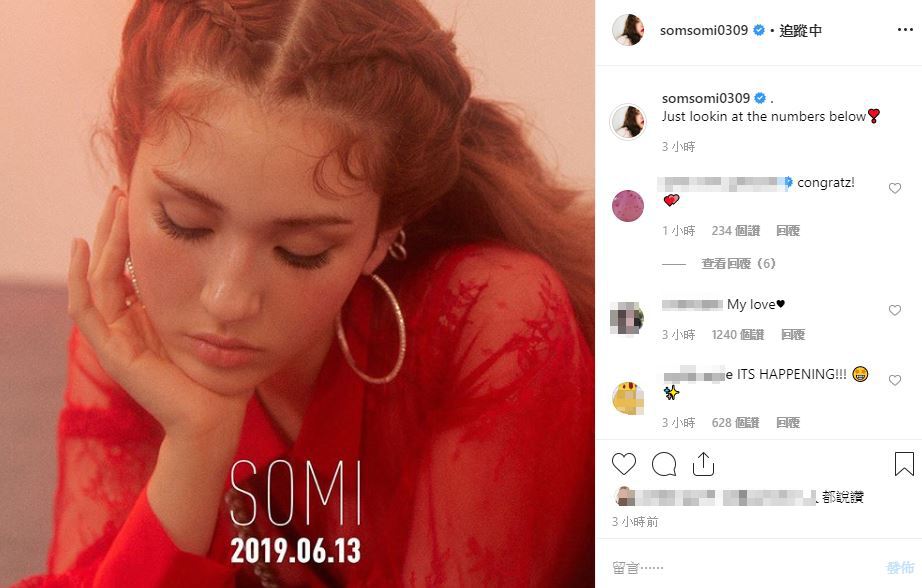 女星Somi全昭彌過去在JYP旗下原先有望成為當紅女團TWICE、ITZY的成員最終卻錯身而過,最終Somi在去年9月跳槽到YG娛樂旗下音樂品牌「The Black Label」,原先更證實將在本月1日出道卻又落空。20日一早,Somi終於透過個人IG發布預告照,確定將在6月13日Solo出道,讓等了許久的粉絲驚呼說到「天啊,真的等不及了」、「好興奮啊」、「明明是凌晨我卻在房間裡尖叫」。