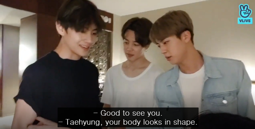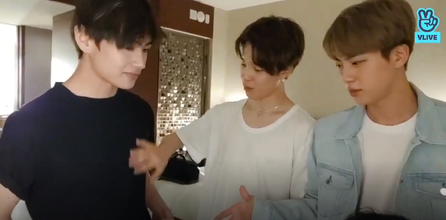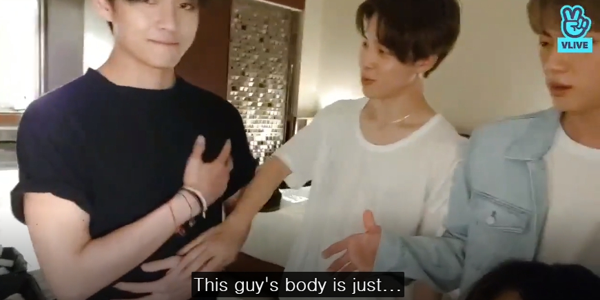 防彈少年團於4日起,在北美展開了《LOVE YOURSELF : SPEAK YOURSELF》巡迴演唱會,19日的紐澤西場正是他們北美巡迴的最後一站,在演唱會結束後,成員Jin與Jimin先是在房間開啟了吃播,隨之成員田柾國也開了直播。在直播中,原先柾國是想要獨自跟粉絲們說一些話,不料成員Jin、Jimin先是來到了房間,隨即成員V也因為看到了前面兩位成員的吃播而跟了進來,當V進入房間時,先是被柾國稱讚「你的身材好好!」,V害羞的解釋到他最近跟柾國一起在運動,在一旁的Jimin不自覺的伸手去碰V的身體,好身材讓Jimin感嘆到他最近因為累了所以都沒在運動。