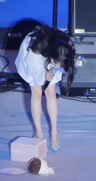 面對突然的驚喜IU帶著笑容看起來相當開心,但是由於兩手要同時拿著花束、麥克風和生日蛋糕,IU一不小心竟讓蛋糕滑落直接掉在舞台地板上,現場粉絲也對突發的狀況相當驚訝,不過IU不僅立即90度鞠躬道歉,對於迅速來處理蛋糕的工作人員,IU也趕緊用手指沾了掉在地上蛋糕吃下,之後再次數度向大家鞠躬表示感謝。