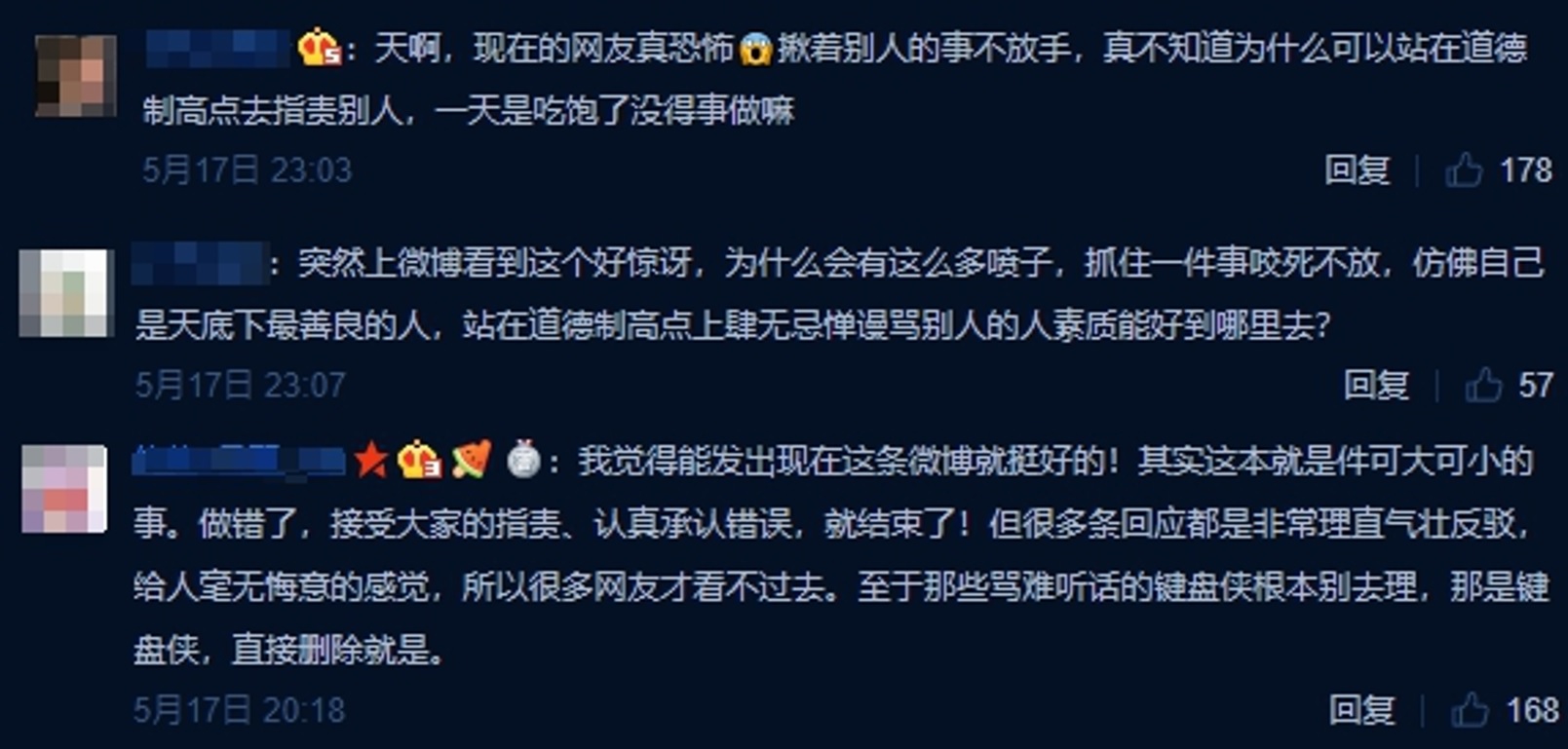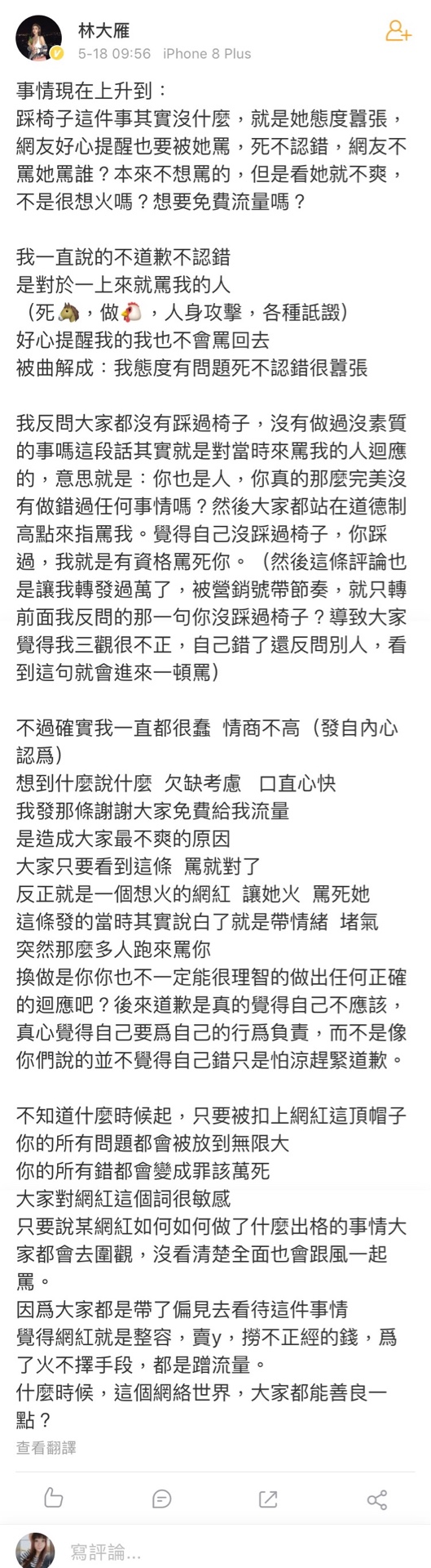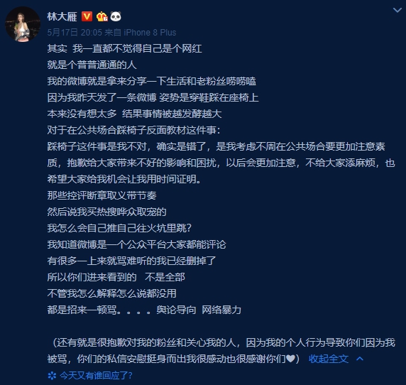 除此之外,或許是難聽的留言激怒了她,讓她甚至發文說:「免費上了個熱門,謝謝你們給我帶流量了!」讓網友們看了覺得她毫無悔意,謾罵更是嚴重。後來事情越演越烈,她便把踩椅子的那則貼文刪除,發了一則道歉文,寫道:「踩椅子這件事是我不對,確實是錯了,是我考慮不周在公共場合要更加注意素質,抱歉給大家帶來不好的影響和困擾,以後會更加注意,不給大家添麻煩,也希望大家給我機會讓我用時間證明。」,除此之外她也特別強調自己並沒有試圖譁眾取寵,要大家別誤會她。此貼文po出後才稍稍平息了眾怒,也有網友認為,有些人責罵的留言確實過於誇張,已構成網路暴力。