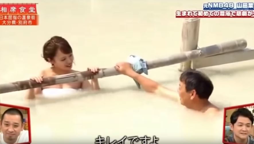 日本女星前大型女團NMB48成員山田菜菜(山田菜々),日前現身朝日電視台的節目《相席食堂》,透過節目走訪日本九州體驗男女混浴,卻沒想到播出中,一名男大叔從溫泉中起身時,裹住下半身的浴巾竟瞬間滑落,而山田菜菜的淡定神情更讓網友笑稱「這也看得太直接了」。