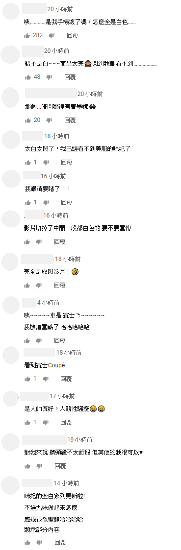 而這次影片上傳之後,因為兩人的舉動相當親密,許多粉絲也留言寫下:「咦…………是我手機壞了嗎,怎麼全是白色……」、「閃到我都看不到」、「那個...請問哪裡有賣墨鏡」、「我沒看到影片我只開到一片白光」、「閃的極致」,也有網友搞笑調侃九妹,「肥宅記對方生理期=死變態!」、「咪妃的全白系列更新啦! 不過九妹做起來怎麼 感覺很像變態哈哈哈哈」。