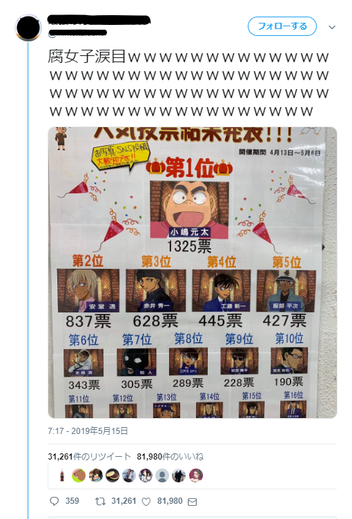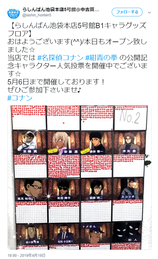 有日本網友在推特上貼上一張在店內拍攝的海報,標題是慶祝電影「紺青之拳」上映,店家在4月13日到5月6日開放粉絲投票,選出在電影中最喜歡的角色,結果一共有5686名粉絲投票,而令人意外的是第一名竟然是少年偵探團成員「小嶋元太」,獲得1325票,贏過第二名的「安室透」837票以及第三名的「赤井秀一」628票,這讓網友看了大吃一驚,貼文被轉貼3萬次,按讚人數更突破8萬人。