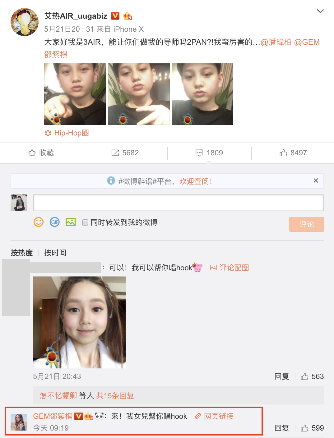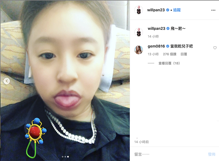 除了在微博上曬照之外,潘瑋柏也在IG上發出一樣的三張照片,但發文的內容寫著:「飛~肥~」,而過去和他一起搭檔《中國新說唱》導師的「鄧紫棋」也在下方留言:「當我乾兒子吧」,兩人的互動相當有趣。而去年勇奪冠軍的選手艾熱也在微博上發出三張嬰兒照,寫著:「大家好我是3AIR,能讓你們做我的導師嗎2PAN?!我蠻厲害的…」,並tag潘瑋柏與鄧紫棋,鄧紫棋也回應:「來!我女兒幫你唱hook 」,三位都相當熱衷於變成小嬰兒。