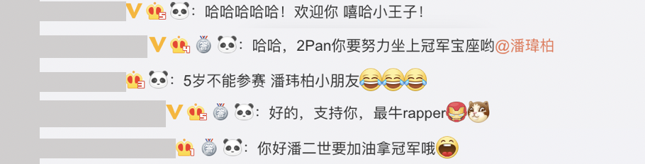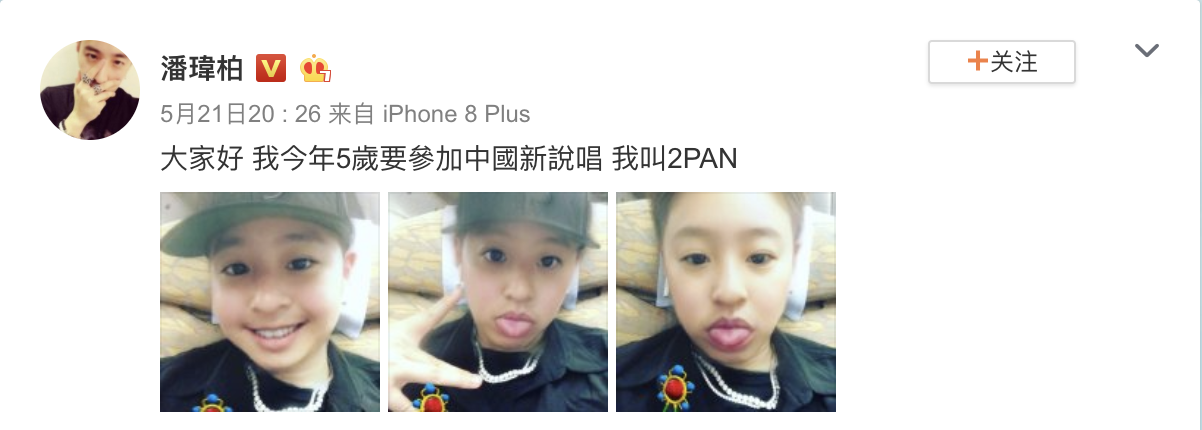 昨日(21號)時潘瑋柏在微博上發出他變成小孩的3張照片,並寫下:「大家好 我今年5歲要參加中國新說唱 我叫2PAN」,照片中潘瑋柏的眼睛變得更大了,配上吐舌的表情十分可愛,揚言5歲要參加《中國新說唱》也成為節目中最年輕的選手。而網友們看見潘瑋柏如此幽默搞笑的照片與貼文後,紛紛留言:「你好潘二世要加油拿冠軍哦」、「好的,支持你,最牛rapper」、「5歲不能參賽 潘瑋柏小朋友」、「哈哈,2Pan你要努力坐上冠軍寶座喲」、「歡迎你 嘻哈小王子!」,大家都相當配合他。