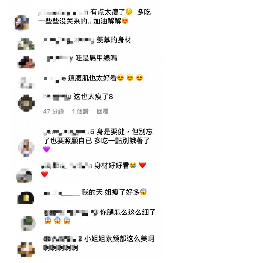 粉絲們看見鄧紫棋的健身照之後,紛紛驚嘆的留言表示:「有點太瘦了,多吃一點沒關係的」、「我的天,姐瘦了好多」、「妳腿怎麼這麼細了」、「身材好好」、「素顏好美啊」、「這腹肌也太好看」、「羨慕的身材」,男友Mark也在下方留了一個肌肉的表情符號,甚至有網友問她能不能開一堂健身的課程,身材令網友羨慕不已。