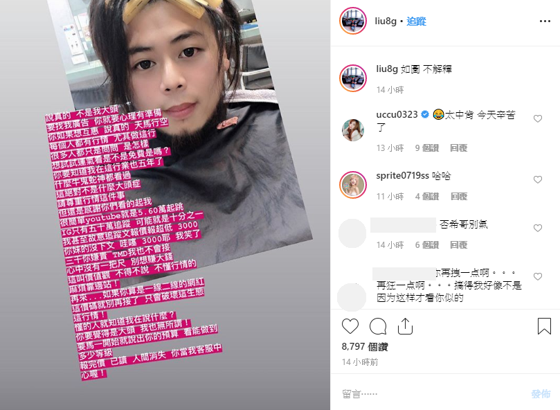 游否希近來常常在IG限時動態中PO出「追蹤文」,也就是PO出其他帥哥美女的照片,號召自己的粉絲去追蹤他們,IG有48萬追蹤的他,也常常在平台上公開喊話,表示自己的追蹤文效果顯著,有需要的人可以找他。不過今疑似是有人問價後已讀,讓他突然在IG爆氣發文,「說真的,不是我大頭,要找我廣告,你就要有心理準備」。