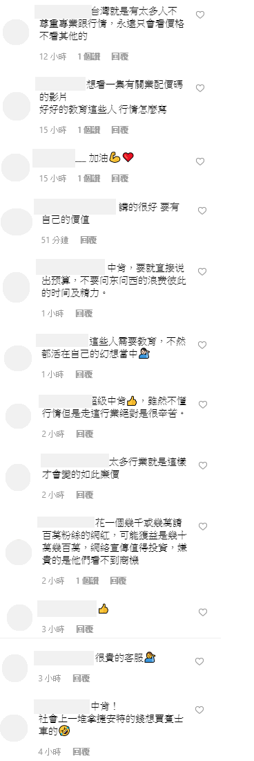 網友見狀也留言:「中肯!社會上一堆拿捷安特的錢想買賓士車的」、「太多行業就是這樣才會變的如此廉價」、「雖然不懂行情但是走這行業絕對是很辛苦」、「這些人需要教育,不然都活在自己的幻想當中」、「講的很好 要有自己的價值」、「想看一集有關業配價碼的影片,好好的教育這些人 行情怎麼寫」,相當認同否希的論點。