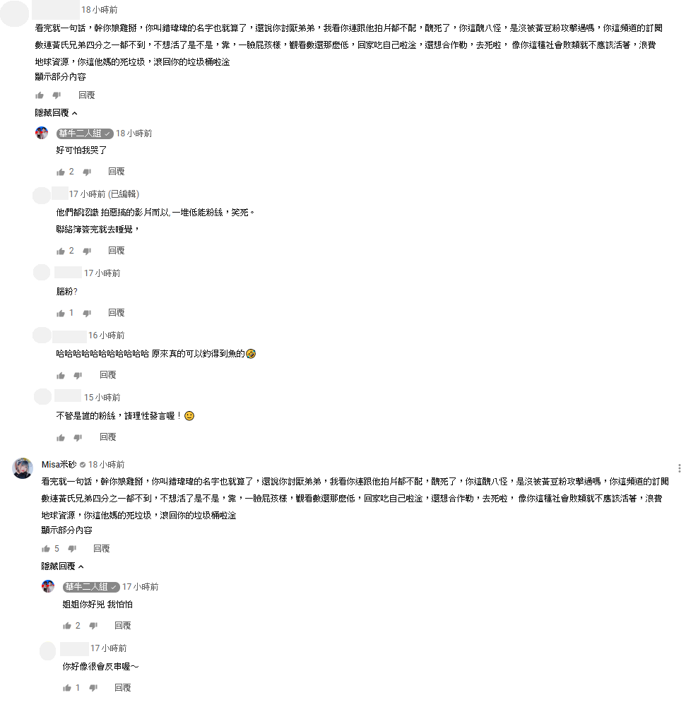 不過影片播出之後,黃氏兄弟的粉絲立刻在下方留言:「你叫錯瑋瑋的名字也就算了,還說你討厭弟弟,我看你連跟他拍片都不配,醜死了,你這醜八怪,是沒被黃豆粉攻擊過嗎?」只見這位網友疑似並不認識鐵牛,也不知道鐵牛和瑋瑋是朋友,因而對於影片內容相當走心,還痛罵道:「你這頻道的訂閱數連黃氏兄弟四分之一都不到,不想活了是不是,一臉屁孩樣,觀看數還那麼低,回家吃自己啦,還想合作勒」,用詞相當狠毒,不過鐵牛也僅僅回覆:「好可怕我哭了」,沒有認真解釋。