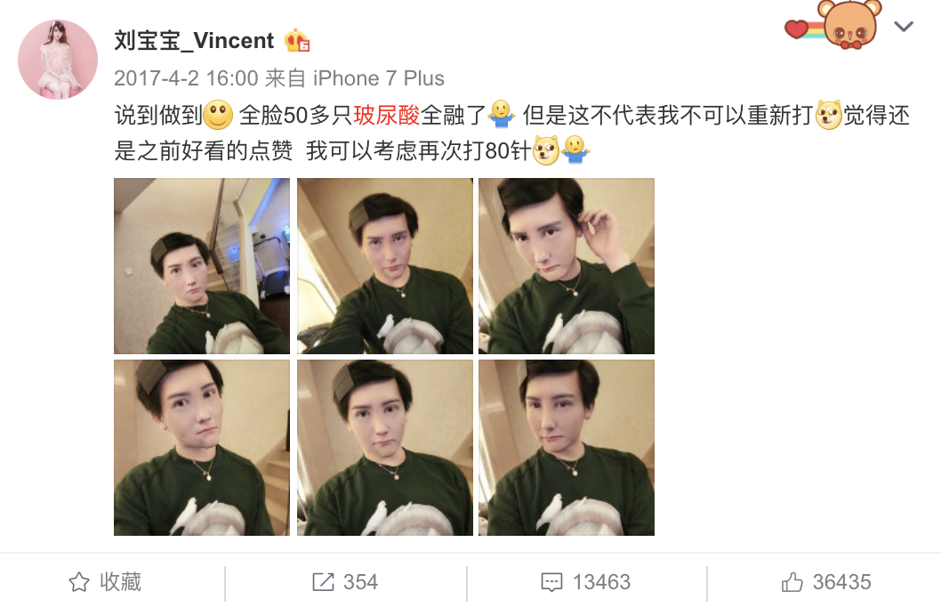 其實早在2017年時,劉梓晨從臉部裡面溶掉了50多隻玻尿酸,似乎是想要回歸自然,他當時也發文寫下:「說到做到,全臉50多只玻尿酸全融了,但是這不代表我不可以重新打,覺得還是之前好看的點讚,我可以考慮再次打80針」,而該則貼文也獲得了3萬6的讚數,溶掉玻尿酸後,劉梓晨的下巴變得正常許多,沒有像過往蛇精臉那般尖銳,顴骨與臉頰的地方看起來也比較有線條,自然許多。