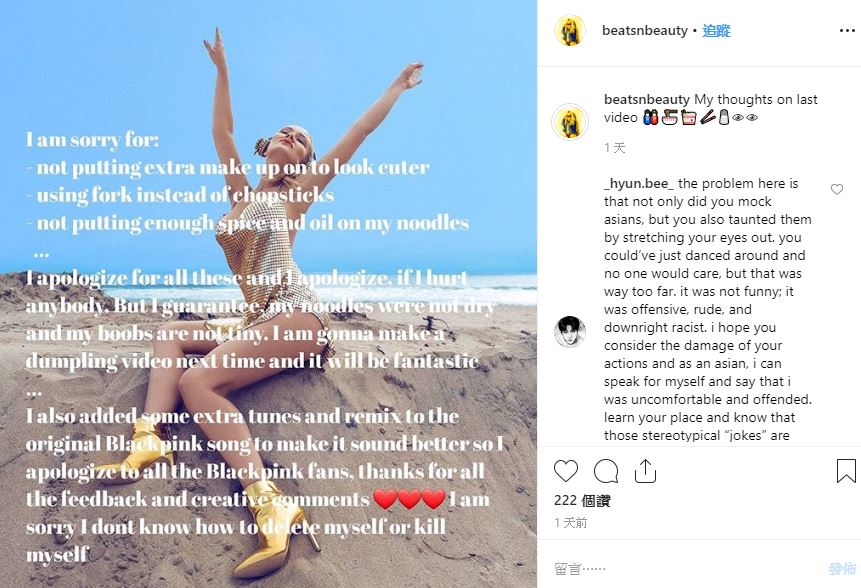 針對網友暴怒洗版,22日,女DJ終於出面道歉,不過字裡行間毫無悔意,再度惹怒網友。聲明中劈頭就表示「我很抱歉沒有化妝讓自己看起來更可愛」,也針對重新編曲《Kill This Love》喊話「讓它變得更好聽,我跟你們道歉」最後更酸言「謝謝大家『有創意的』評論,我真的不知道要怎麼把影片下架」狂妄發言讓網友全看傻眼。