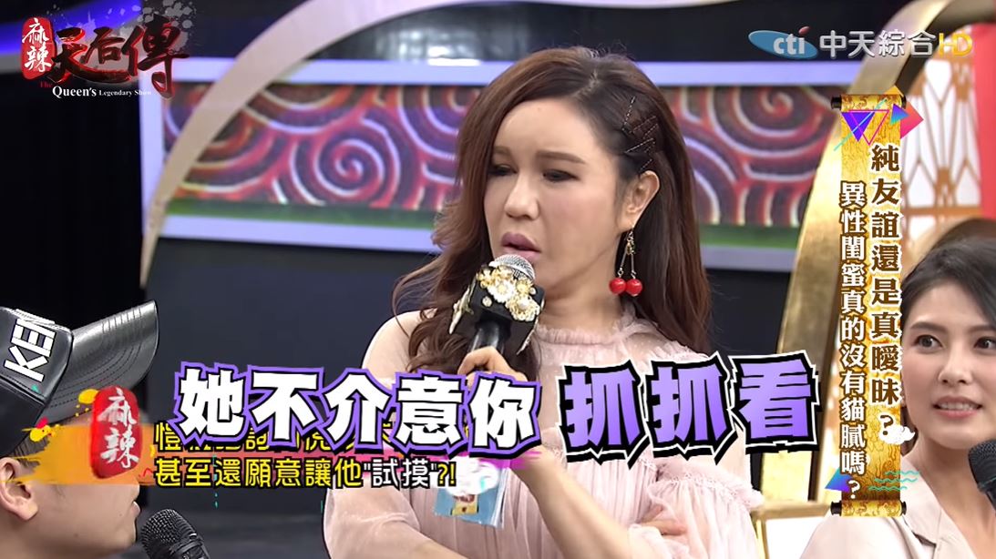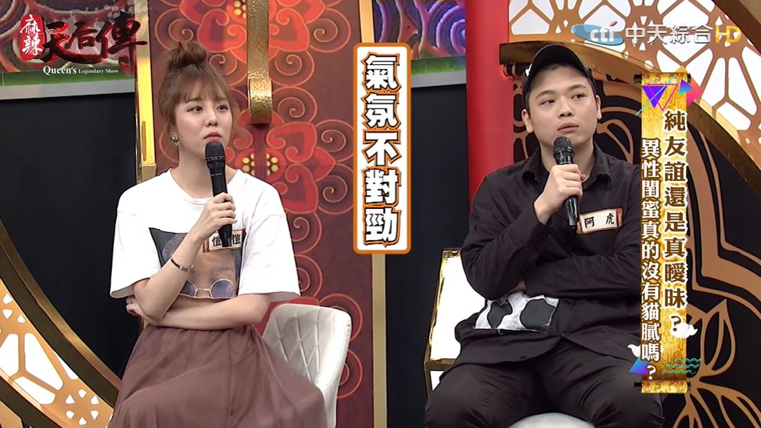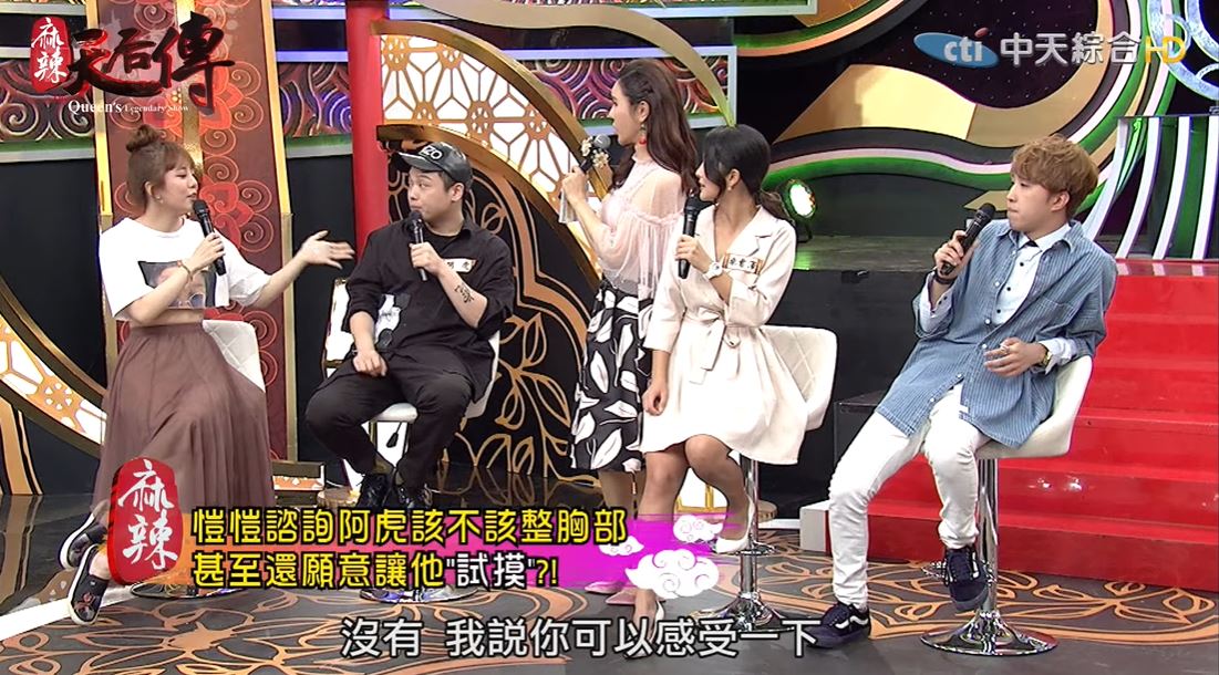雖然阿虎和愷愷只是朋友,但阿虎會去擔心愷愷穿得太露,愷愷也常常買貴重的禮物送他,甚至幫對方辦生日趴,兩人互動完全就像情侶。愷愷坦言她還問過阿虎:「我該不該去隆胸」,甚至要阿虎抓抓看:「你可以感受一下~你覺得我需不需要弄胸部。」原本一直故作鎮定的大根聽不下去,冷不防丟來一句:「感受什麼啦!」飄出濃濃的火藥味,現場氣氛也變得有些尷尬。