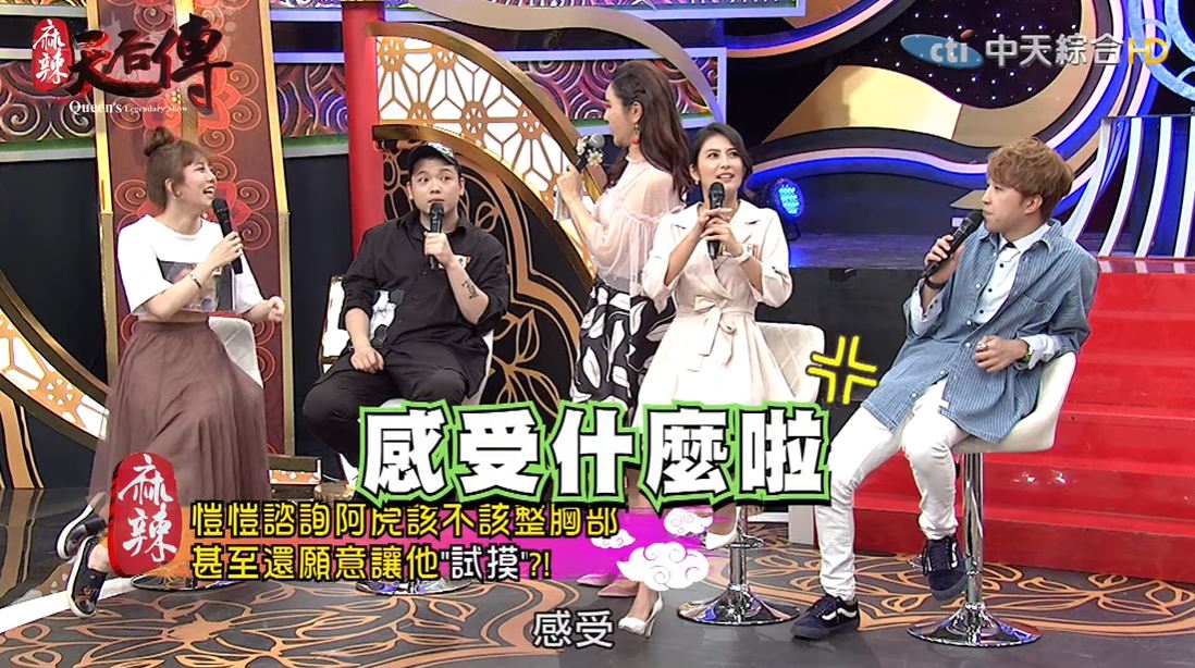 個性搞笑的大根現在是《麻辣天后傳》的助理主持,過去他曾和「國光女神」愷愷有過一段情。沒想到愷愷日前受邀上節目,和他們兩人的共同好友阿虎互動曖昧,兩人時不時有肢體接觸,甚至愷愷還大方邀請阿虎摸胸部「感受一下」,讓原本一直故作鎮定的大根理智線秒段,忍不住嗆聲:「感受甚麼啦!」