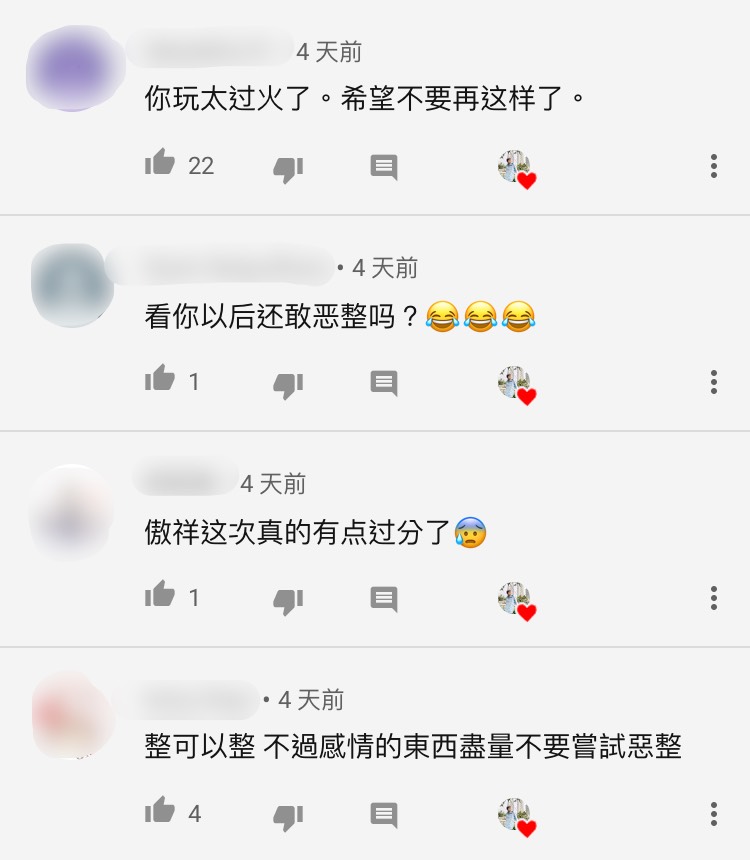 傲祥表示自己不知道會這麼嚴重,鬧到兩人快離婚,之後會彌補他們以示歉意。影片出來後,傲祥被網友罵翻:「你玩太過火了」、「傲祥這次真的有點過分」、「玩太大了…可憐的嫂子」而他也有在自我反省,相信下次會更懂得拿捏分寸。