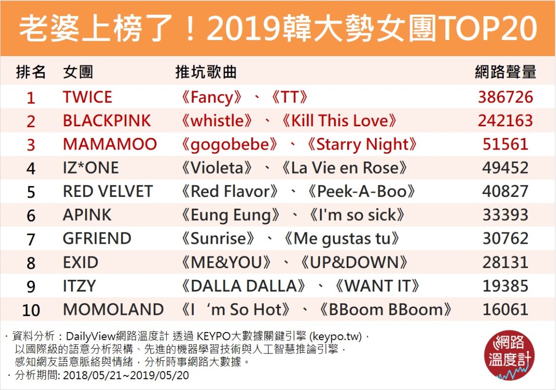 根據《KEYPO大數據關鍵引擎》分析從2018年05月21日起至2019年05月20日止,韓國2019大勢女團TOP10,其中前五名的大多屬2014年後出道的第四代女團,其中IZ*ONE以新人之姿,闖入了前五名,以下盤點韓國2019的大勢女團。