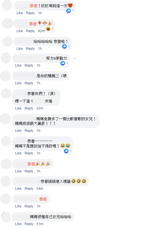 粉絲也紛紛留言:「媽媽很懂自己女兒哈哈哈」、「 媽媽免費多了一個比較喜歡的女兒!媽媽成最大贏家!!!」、「恭喜~~~~~~~~媽媽不是應該捨不得的嗎?」、「恭喜!終於等到這一天」、「恭喜綺綺進入墳墓」、「恭喜你們!!!!」貼文也在一個小時內便累積了一萬多讚、近百則轉發,可見人氣之高!而今天除了Aida&綺綺之外,同志YouTuber「逼逼日記 BBDiary」也在今日登記結婚,好消息不斷!