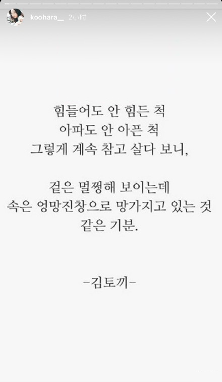前KARA成員具荷拉於25日在自身IG的限時動態寫下「再見」、「即使很累也要裝作不累,即使很痛也要裝作不痛」、「過你所愛的生活,愛上你的生活」、「假裝幸福,現在想放棄,不想讓人擔心」等對世界絕望的言論,隨即又刪除。不料,26日凌晨就傳出她企圖於清潭洞住宅自殺之消息,江南警察署指出具荷拉經紀人因聯絡不上具荷拉,於是前往其住家,卻發現具荷拉昏迷於屋內,在立即送醫搶救20小時後,目前具荷拉的呼吸脈搏恢復穩定,雖然還未恢復意識,但已暫時脫離生命危險。