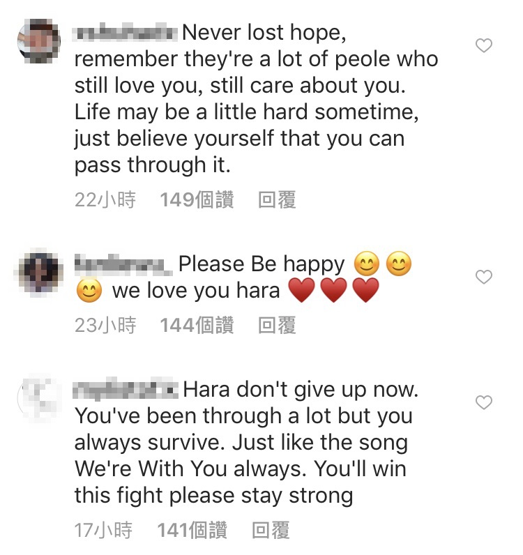 在得知她已脫離生命危險後,許多粉絲紛紛到她的IG下留言為她打氣,表示「希望她不要失去希望」「還是有許多人愛你要好好照顧自己」「請勇敢的活下去吧」等暖心的鼓勵。