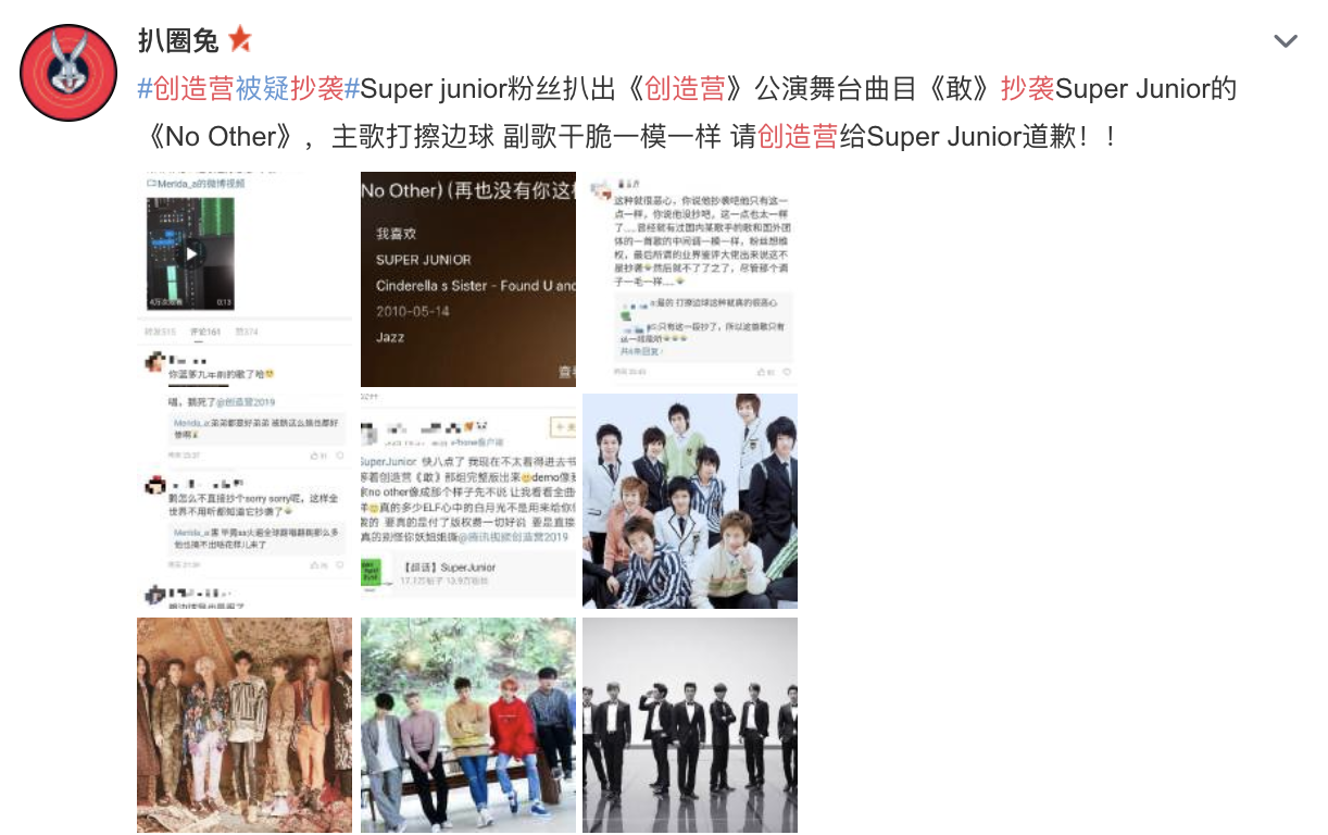 大陸男子選秀節目《創造營2019》於4月6日首播,這次由迪麗熱巴擔任男團發起人,導師包含:郭富城、蘇有朋、黃立行、胡彥斌,而這次節目最大的特點之一就是選手們並不是練習生或是初學者,而是頂級男團成員們的較量,因此在節目開播前名單曝光時,就有看見許多擁有高知名度的男偶像前來參賽。目前節目進行到第3次公演舞台,其中有一隊伍的歌曲被網友發現副歌旋律和Super Junior的《No Other》幾乎一樣,引發網友不滿。
