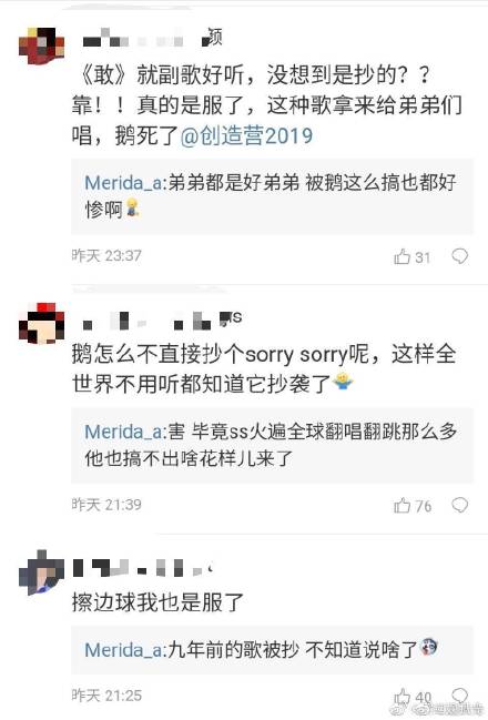 目前《創造營2019》節目進行到第3次的公演舞台,各組將和不同的女藝人一起合作,合作的對象包含:歐陽娜娜、徐夢潔、李蘭迪、陳鈺琪、祝緒丹、宋妍霏,六位助演學姐現身舞台與學員們一起完成表演。其中由翟瀟聞、李昀銳、秦天、段浩男、肖凱中、馬雪陽及王藝衡組成的隊伍和陳鈺琪合作演出《敢》,卻被大批網友發現副歌的地方和Super Junior在2010年發行的歌曲《No Other》幾乎一樣,許多粉絲氣憤痛罵:「以為抄這麼一兩段我們就聽不出來了?」