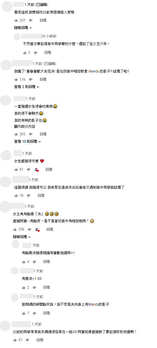 兩人雖然已經時隔許久未見,不過相處仍然相當自然,阿憲的表現也讓許多網友看見端倪,留言寫道:「看完這段,我懷疑你以前有想過追人家哦」、「誰沒事記得高中同學愛吃什麼,還記了至少五六年。」而因為Mandy外型氣質漂亮,也有許多網友討論:「我懂了! 憲會喜歡大食怪泱! 是在找高中暗戀對象 Mandy 的影子!! 結婚了啦!」、「阿憲以前是不是暗戀過對方,原來是在泱泱身上看見高中同學的影子 XD」、「有像泱泱啊,而且也是個吃貨。」
