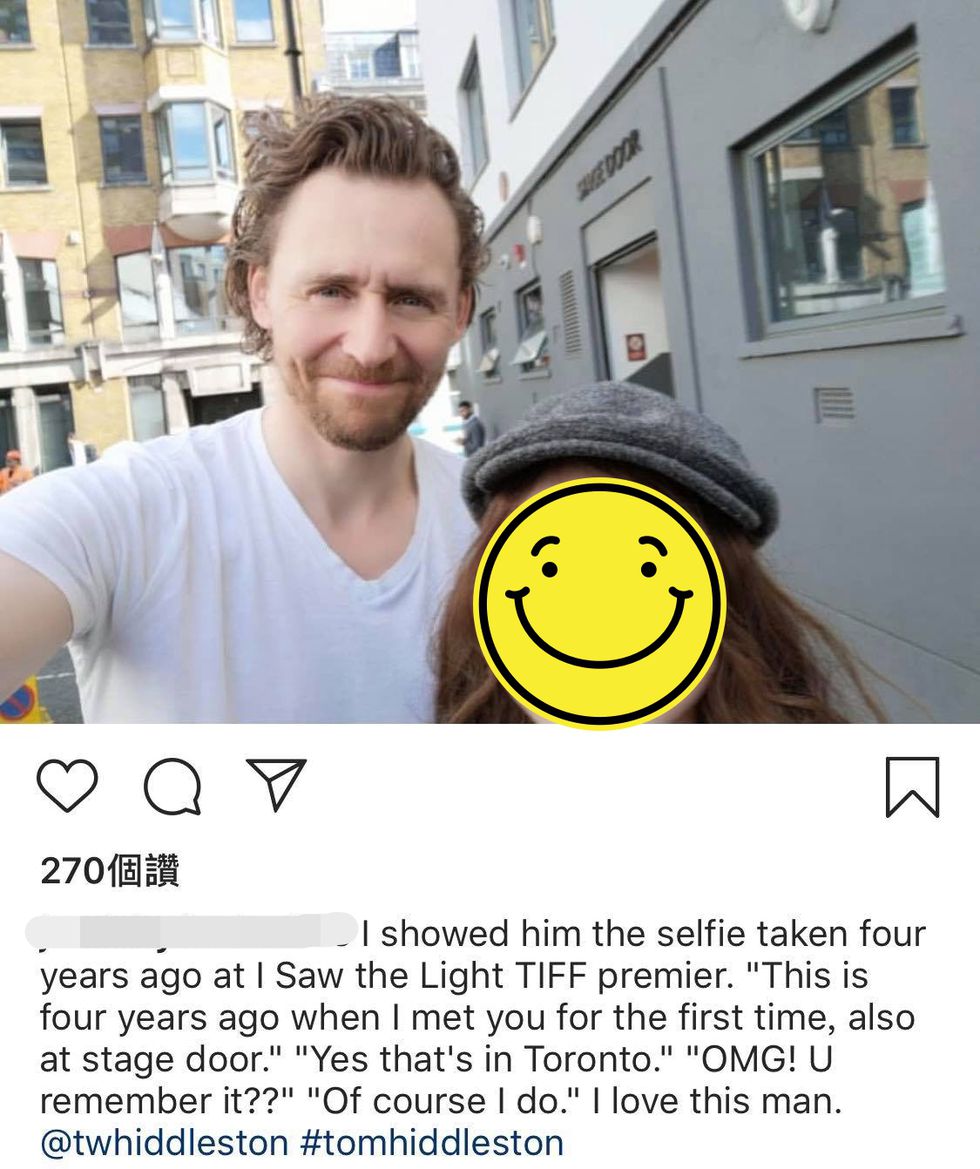 事實上,根據該名粉絲IG透露,4年前,他就曾在同一地點和湯姆希德斯頓見過面,而男神竟然都記得。當時粉絲拿出當年的合照時,湯姆希德斯頓竟認出表示「這是四年前我第一次見到你的時候,也是在後台入口。」當粉絲驚呼「你還記得?」,湯姆希德斯頓就回應「我當然記得啊!」總總暖男行徑已經撩了不少女粉的心。