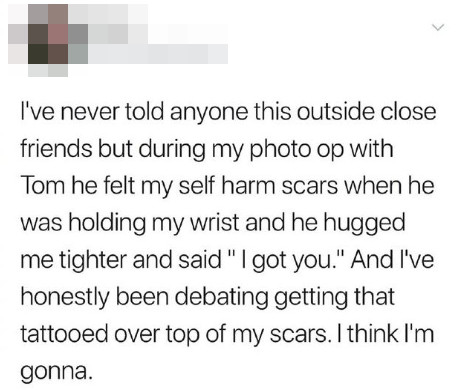 因飾演索爾的弟弟「洛基」而爆紅的英國男演員湯姆希德斯頓,私底下多樁親民作為近日在網路上瘋傳。日前就有一名粉絲爆料,他過去曾和湯姆希德斯頓合照,沒想到手上留下的自殘疤痕竟然被湯姆希德斯頓看見,他隨即緊抱該位粉絲並說到「I got you.」,事後該位粉絲難忘表示「我一直都在想是否要把這句話刺在疤痕上,我想我會這麼做」。