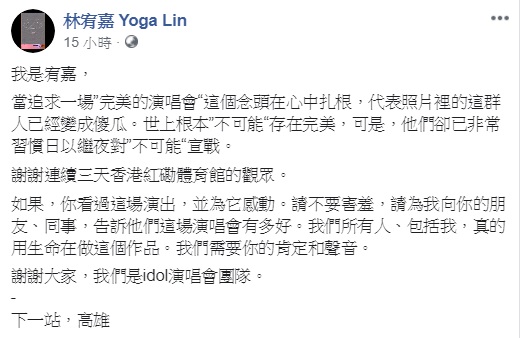 林宥嘉27日晚間貼出演唱會工作人員大合照,也謝謝大家為這場演出付出的努力,「如果,你看過這場演出,並為它感動。請不要害羞,請為我向你的朋友、同事,告訴他們這場演唱會有多好。我們所有人、包括我,真的用生命在做這個作品。我們需要你的肯定和聲音。」林宥嘉也開心與工作人員合照,並比出「YA」的手勢。