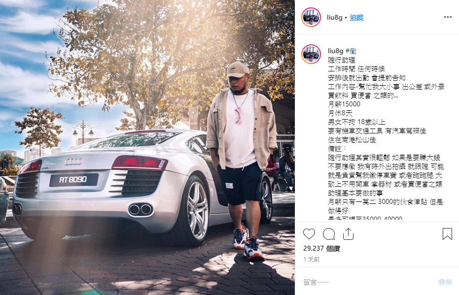否希昨日在IG中發布徵人啟事,開出「隨行助理」的職缺,否希說明工作時間是「任何時候,安排後就出勤 會提前告知」,他也介紹工作內容,「幫忙我大小事 出公差 或外景 買飲料 買便當 之類的」,雖然看似簡單卻也十分繁瑣,令人跌破眼鏡的是,否希開出的條件中,竟然直接寫明「月薪15000」!