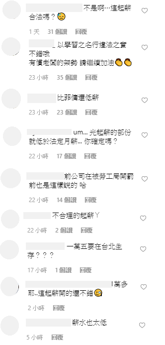 不過文章發布之後,網友也紛紛留言:「不是啊⋯這起薪合法嗎?」、「以學習之名行違法之實 不錯哦,有慣老闆的架勢 請繼續加油」、「比菲傭還低薪」、「um... 光起薪的部份就低於法定月薪... 你確定嗎?」、「前公司在被勞工局開罰前也是這樣說的 哈」,引起熱烈討論。