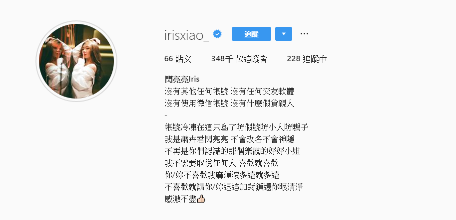 而今閃亮亮則重新在IG中放上頭貼,也在自介的地方打上:「帳號冷凍在這只為了防假號防小人防騙子,我是蕭卉君閃亮亮 不會改名不會神隱,不再是你們認識的那個樂觀的好好小姐」,一改了過去溫暖的敘事風格,決絕表示:「我不需要取悅任何人,喜歡就喜歡,你/妳不喜歡我麻煩滾多遠就多遠,不喜歡就請你/妳退追加封鎖,還你眼清淨」,改變非常大。