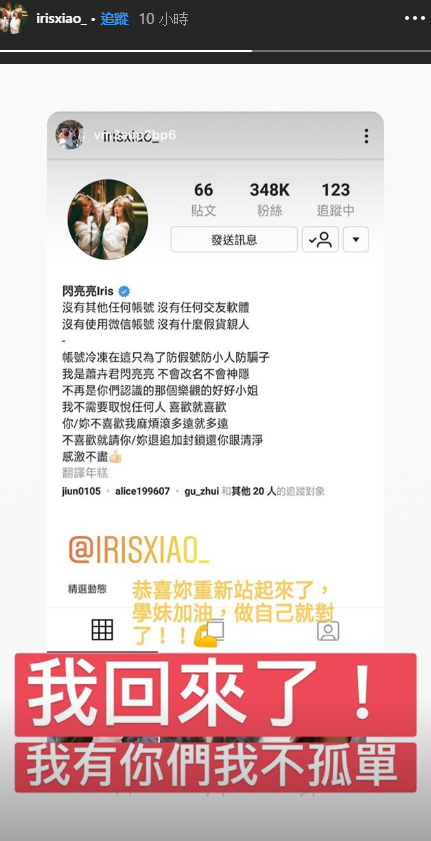 閃亮亮重新現身後,也有好友在限時動態中發文:「恭喜你重新站起來了,學妹加油,做自己就對了!」而閃亮亮也回應:「我回來了,我有你們不孤單」,宣告回歸。