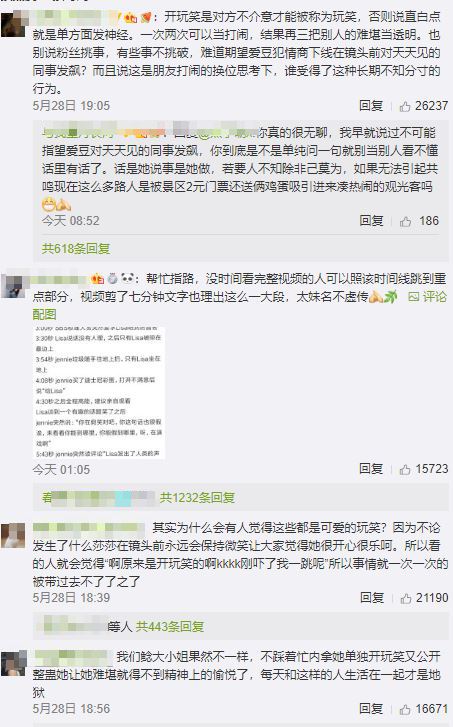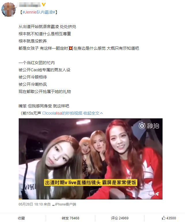 29日,女團BLACKPINK的成員Lisa、Jennie名字並列出現在大陸微博熱搜榜上第2名,其中一個Lisa的粉絲團,集結了BLACKPINK出道以來在Vlive直播或團綜中,Jennie和Lisa的互動,更誇張標記「Jennie隊內霸淩」。該網友將他認為Jennie霸淩成員的畫面集結成影片,包括不斷擋住Lisa的鏡頭,甚至成員Jennie、Jisoo和Rose也三人遮住Lisa並說到「三人團回歸BLACKPINK」。
