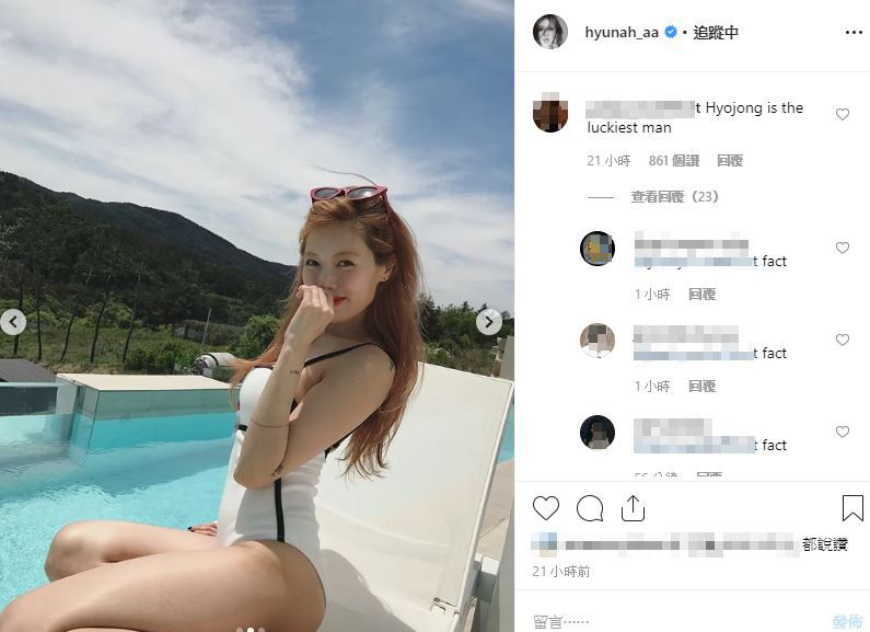 韓國女星泫雅和男友金曉鐘離開前東家後,今年1月終於和Psy自創的新公司P Nation簽約,沉寂好一段時間的泫雅,近期也開始在大學祭典復出,一如往常的火辣演出再度引起外界熱烈回響。泫雅的IG也開始有大量性感照片,28日,他公開一組泳裝照,大方露出姣好身材,就連肩帶都被上圍撐開了,網友也忍不住調侃「金曉鐘真的好幸運」。