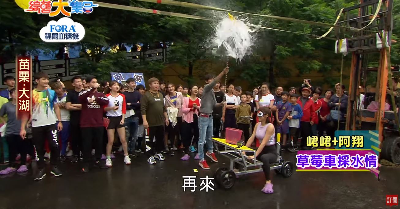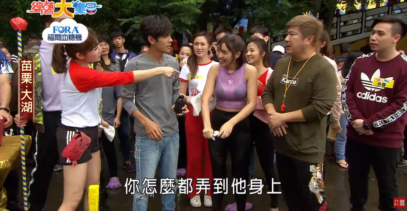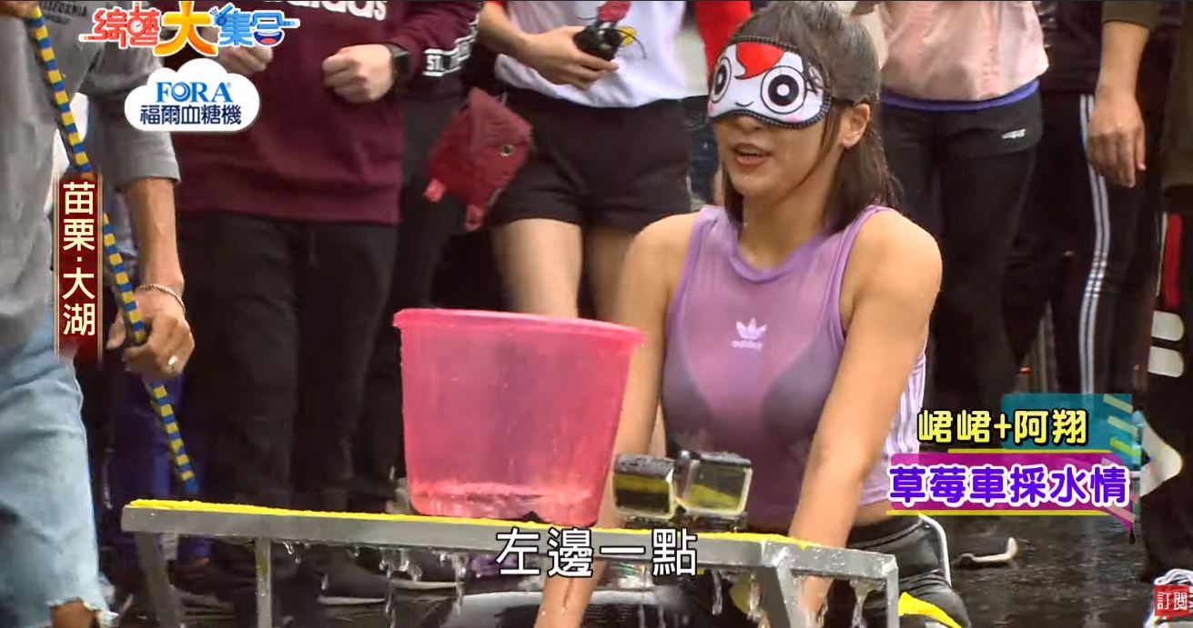 當天峮峮穿著淺紫色的短版運動背心,下半身搭配黑色貼身運動長褲,好身材嶄露無遺。其中一個關卡,峮峮必須蒙著眼睛踩草莓車前進,阿翔要對準水桶戳破水球,接到越多水的隊伍獲勝。只是阿翔似乎都慢半拍,水幾乎全灑在峮峮的身上,淺色上衣全濕,黑色的內衣全被透了出來,眼罩一拔下來她忍不住對阿翔大喊:「你都倒到我身上了!」連其他來賓也替她抱不平:「目的太明顯了!」