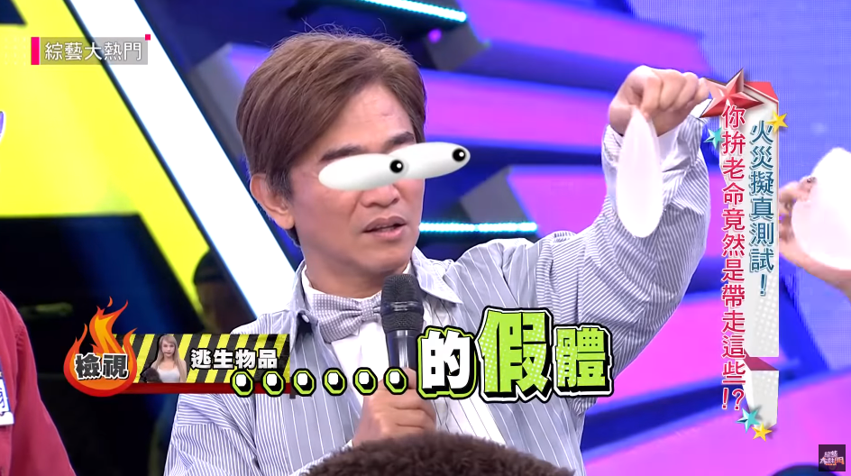 小A辣保持著逃難時的原裝扮進了攝影棚後,憲哥也開始一一看看小A辣都帶了什麼,沒想到小A辣竟從行李箱中拿出頭骨模型,他也解釋:「因為我的臉有整型,我想說到時候燒傷毀容的話,可以叫醫生幫我重建」,接著更拿出胸部的假體,指胸部說道:「我想說如果燒壞了,可以塞回這個」,讓憲哥和LULU哭笑不得直說:「你真的想很多」,不過小A辣其餘只帶了化妝包和手機,雖然箱子大卻也沒有裝什麼。