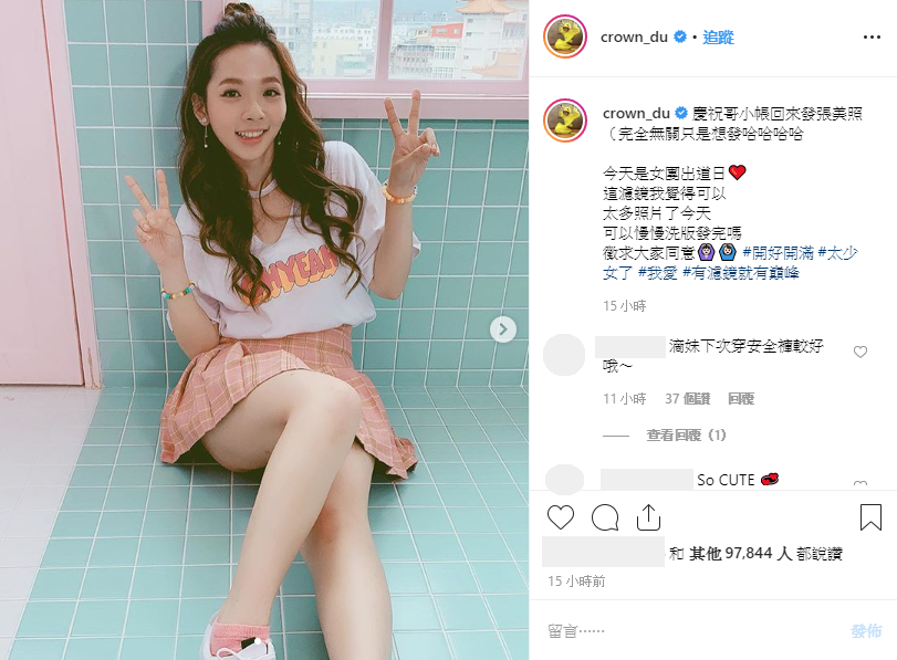 照片發布後,網友紛紛留言:「滴妹下次穿安全褲較好哦~」、「So CUTE」、「哥哥這樣可以嗎」、「又辣又可愛」、「太可愛了啦~~~~喜歡妮」、「請繼續不戴眼鏡吧!!(誤」、「滴妹可以原地嫁我嗎 好可愛啊啊」,這群人的董仔也留言:「這樣要放小草莓啦」,相當替滴妹著急。