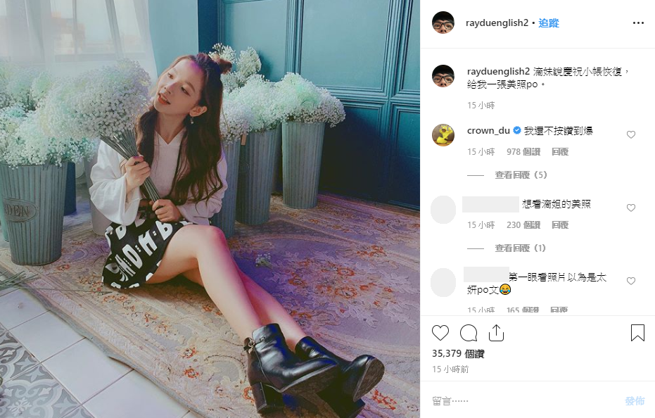 另一方面阿滴也在自己的小帳「rayduenglish2」發布另外一張滴妹不同造型的照片,只見這次滴妹換上了黑色短裙,捧著花束的模樣看起來就像不經世事的少女,而滴妹自己也留言:「我還不按讚到爆」,相當可愛。