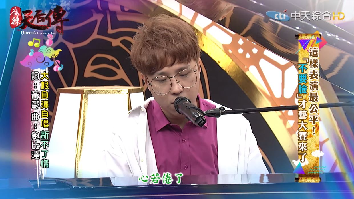 大根臨時被利菁cue上場「自彈自唱」,還補了一槍「就是臉耽誤了他,不然他真的很有才藝的!」讓大根聽了不知道該笑還該哭。沒想到大根隨手一彈《新不了情》,瞬間讓現場所有人為之驚艷,利菁也在一旁大喊:「好帥喔!」更強調大根的鋼琴是自學的。