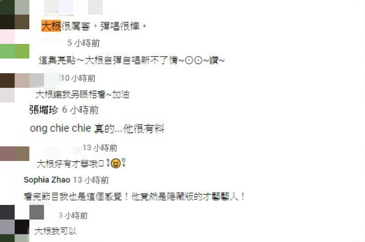 雖然是臨時被cue上台,但大根的台風相當穩健,唱起歌來也是有模有樣,琴藝更是讓大家讚嘆連連,網友們看了也忍不住說:「大根很厲害,彈唱很棒!」、「這集亮點~大根自彈自唱新不了情」、「大根讓我另眼相看~加油」、「大根好有才華哦」、「看完節目我也是這個感覺!他竟然是隱藏版的才藝藝人!」、「太扯了!看不出來耶!」