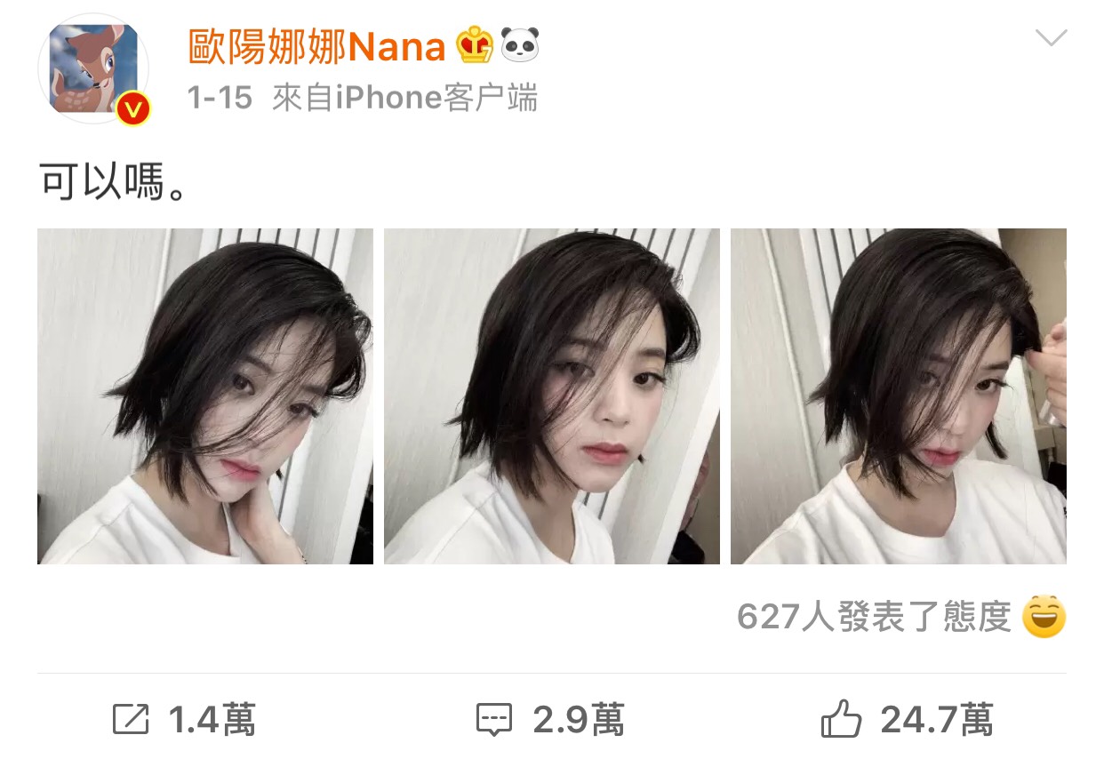 過去歐陽娜娜也曾發過短髮照上傳微博,在當時也引起粉絲的討論,直呼:「不要是真的!」、「不適合!」,不過也有另一票粉絲表示:「真是太帥了」。可見這次娜娜嘗試了短髮造型,顯然要突破自己。意外和大S撞造型,也讓粉絲們直呼:「居然看起來沒有比大S年輕」、「氣質不對,把年輕小女孩拍成少婦氣質」、「確實好看只是不適合」