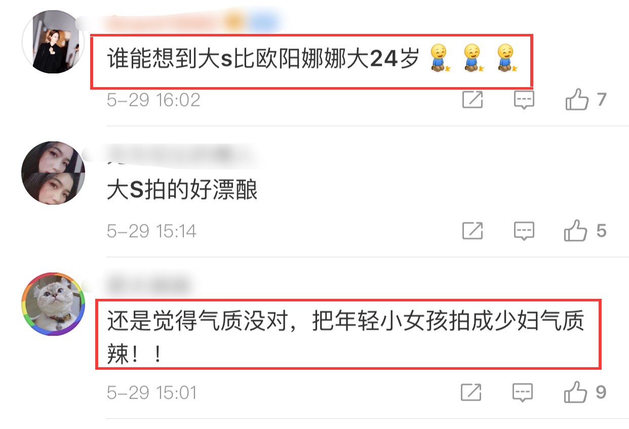 這次的拍攝歐陽娜娜也在微博發表聲明「每一次的改變」,可見歐陽娜娜想嘗試不同的裝扮、突破自己。在過去大S也曾拍攝過曬傷妝,意外成為這次網友注目的焦點,與歐陽娜娜將頭髮勾到耳後的照片一比,兩人都有著洋娃娃般的臉蛋,同樣瀏海在眉上,橘色調的口紅,激短髮造型,引起大家熱烈討論。兩人年齡的差距,43歲的大S和18歲的歐陽娜娜,從照片給人呈現出各有千秋,大S卻意外的成了這次焦點,成為議論的對象,引起廣大回響,沒有人相信大S竟然已經43歲了,直呼這顏值簡直是逆天的成長,真的好漂亮呀。