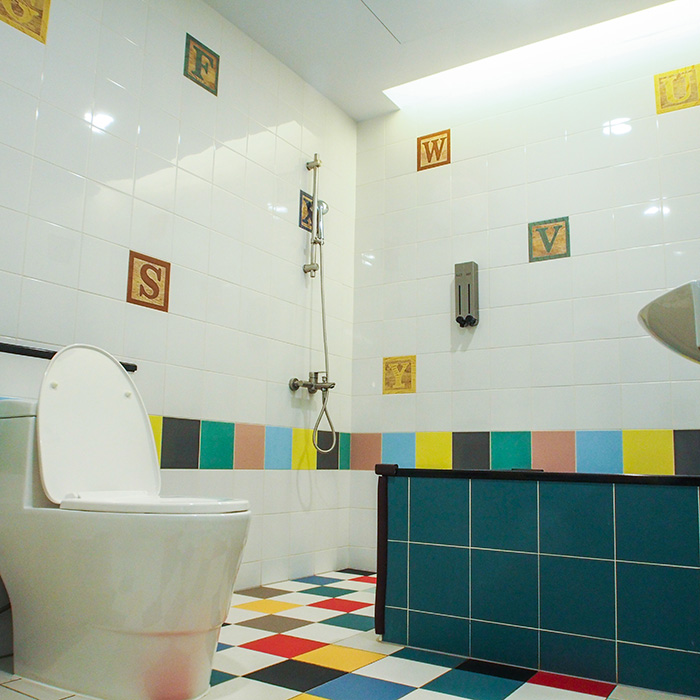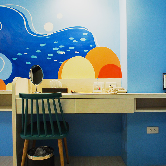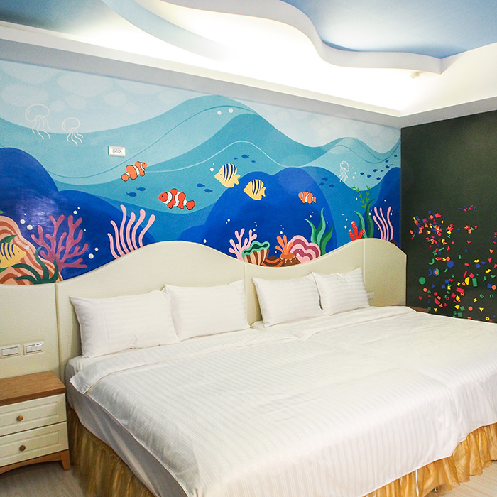 有沒有超級Q!!這間其實是四人親子房,牆壁上充滿藍色為主的水族塗鴉,連浴室也有繽紛可愛的磁磚,看到這個浴缸我還不泡他個3小時XD然後最有趣的是床旁邊還有磁鐵可以讓小朋友玩喔!就算是朋友出遊,花點小創意,也可以在這裡找回童心?哈哈