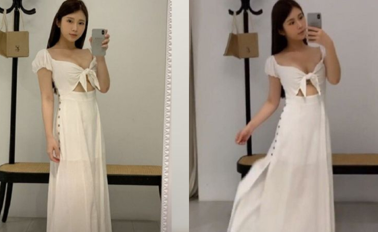 雞排妹PO出自己試穿洋裝的照片,只見他披著一頭氣質的長直髮,身穿著白色的長洋裝,上半身胸前不僅超級深V,肚子更是簍空設計,中間只靠一個結連接兩塊布;下半身的長裙雖然將她美腿全遮住,但仔細一看,裙子的高衩開到大腿,且大腿以下的薄紗設計,若隱若現更加性感,不僅仙氣滿分,性感指數更是爆表!