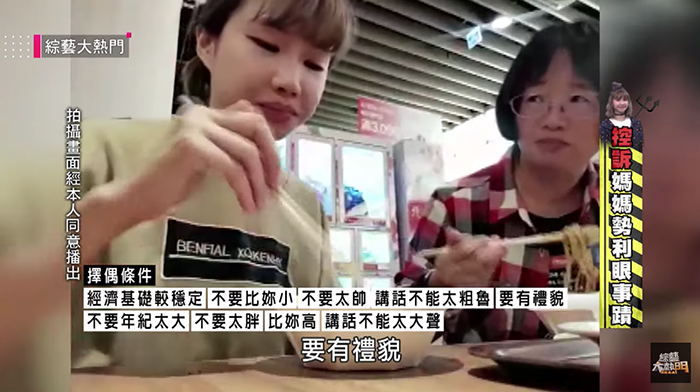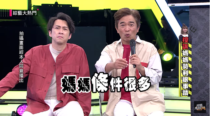「天氣女孩」的「嗨獎」也指控媽媽,說她對自己的另一半提出一大堆要求,包含「經濟基礎穩定」、「不要比你小」、「不要年紀太大」、「不要太胖」、「不要太帥」、「比你高」、「講話不能太大聲」、「不能太粗魯」、「要有禮貌」等9個條件,不僅她傻眼,「我媽媽怎麼會是這樣子的人」,就連吳宗憲也說:「媽媽條件很多欸!」